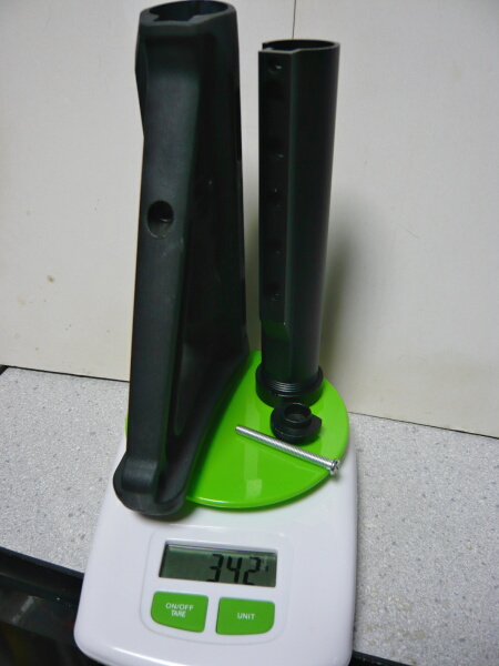 他の使ってない銃からマグプルMOEストックをもいできました。ストックチューブとストックの合計で342g。