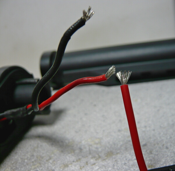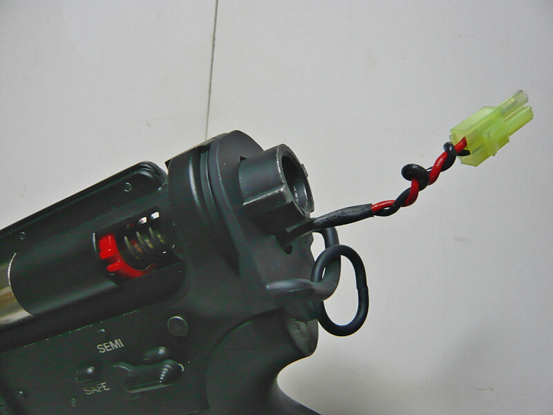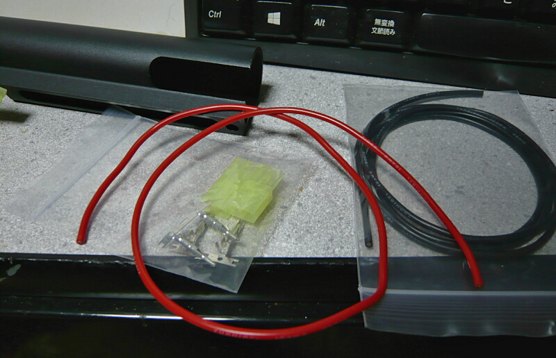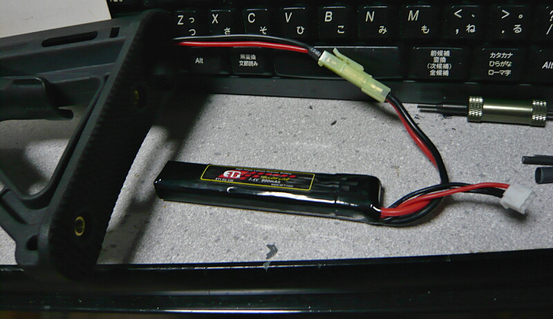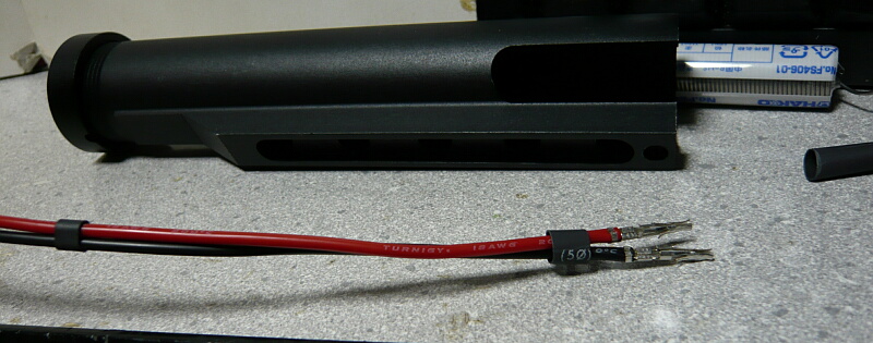できました。元の配線部分はバッテリーと隣接して真っ直ぐ伸びるだけなので固くても問題ありませんが、ストックチューブから外に出る部分は柔らかい線でないと余りの配線をストックチューブに収める際に面倒が出ます。