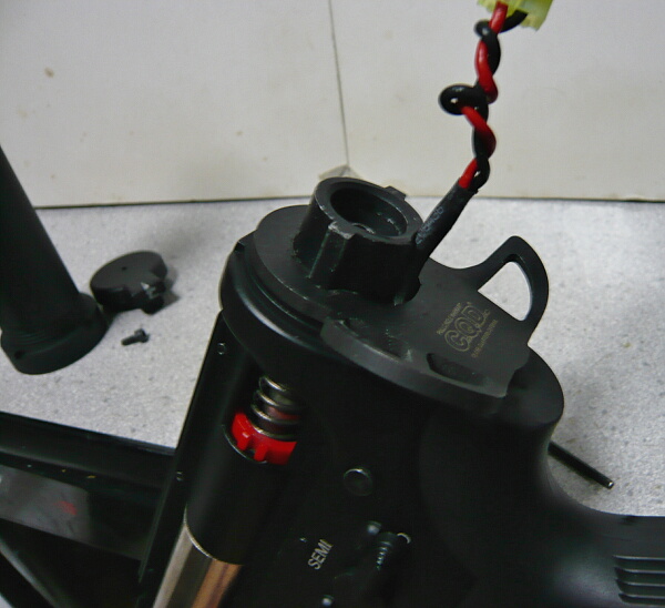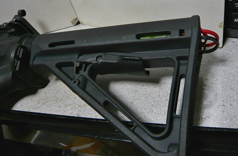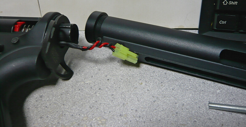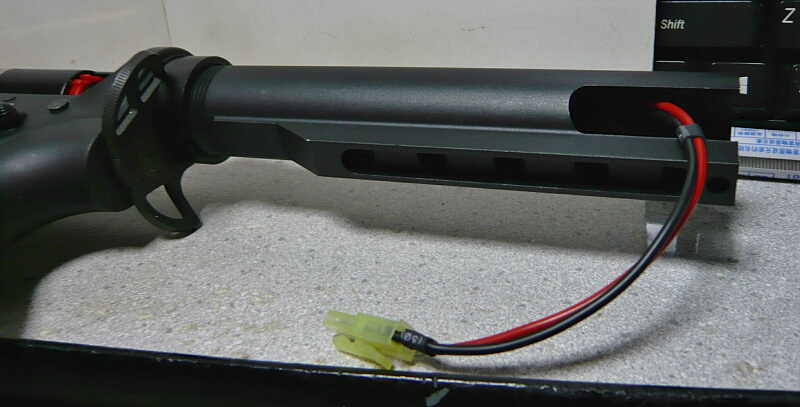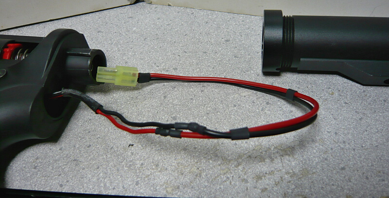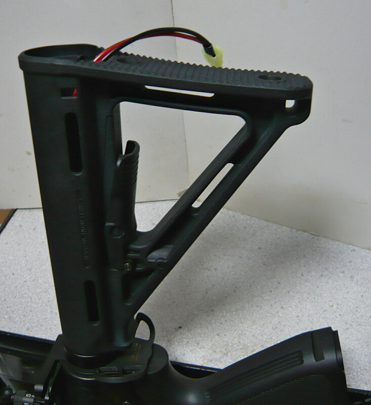 ストックを装着。バットプレートでストックチューブ後方が塞がっているストックの場合はバッテリーをストックチューブに収めてからストックを装着すれば良いですが、配線がはみ出ているとストック内に引っ掛けたりして断線の危険があったりして面倒に感じるかもしれません。