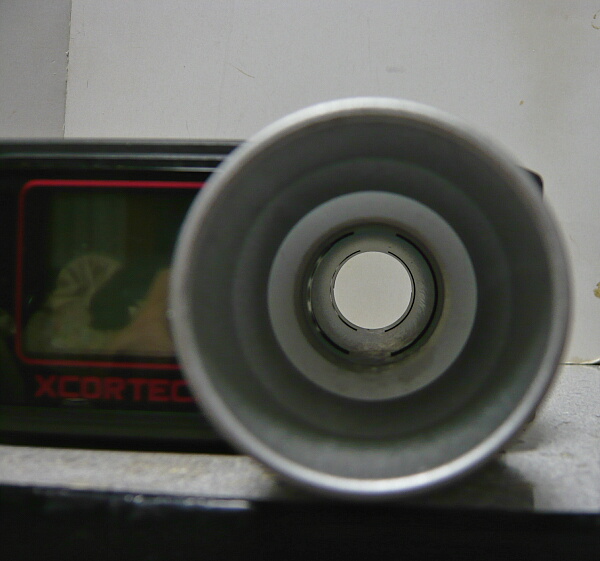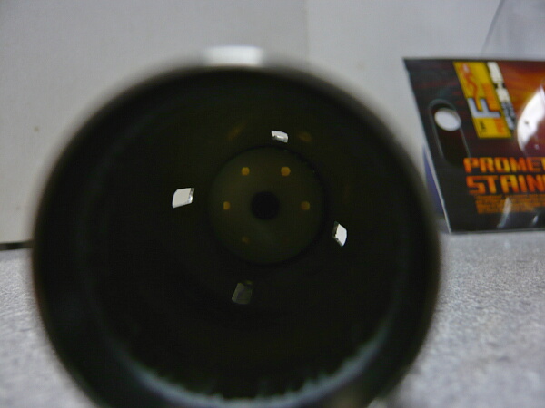 一方で初速がグダグダだった方のピストンヘッドを通してみると新月のような隙間が確認できます。前進するピストンヘッドは前面の穴からOリングの前に空気が通り、その空気圧でOリングをピストンヘッド後方とシリンダー内へ押し付けるようになっているので、静止状態で隙間が見えるからといって必ずしも圧縮抜けをしているとは限らないのですが、しかしこの組み合わせで初速がたった10m/sしか出なかったのは相性が明らかに悪かったといえます。またノーマルのフルシリンダーとでも40m/sしか出ていないので、やはりこのシリンダーヘッドは使用をやめておいた方がよろしいようで・・・
