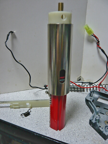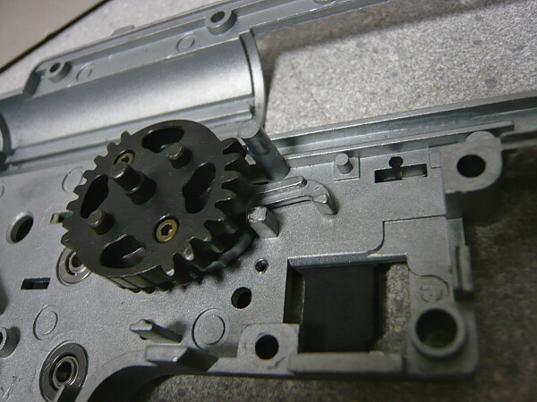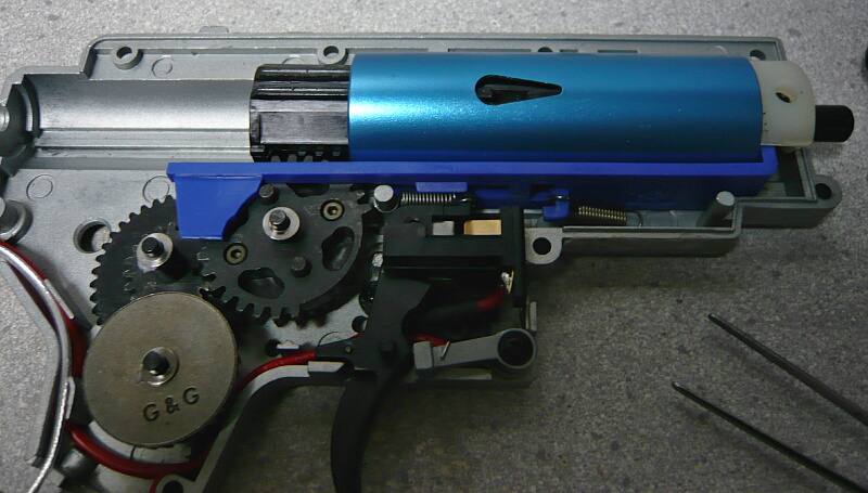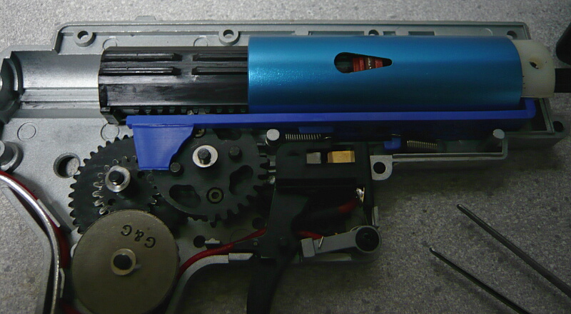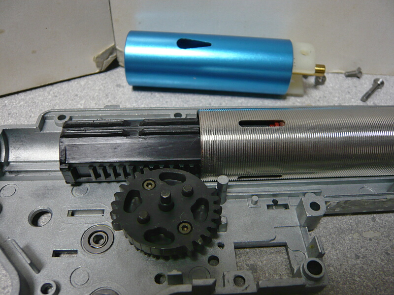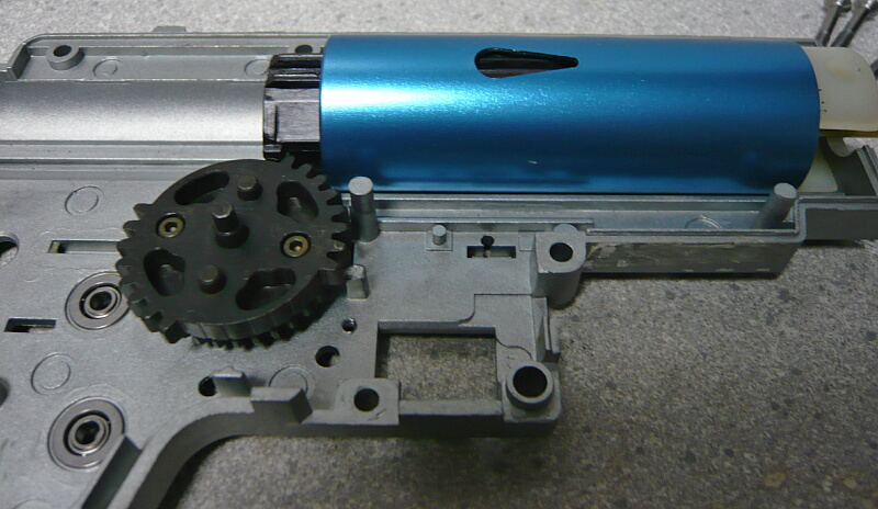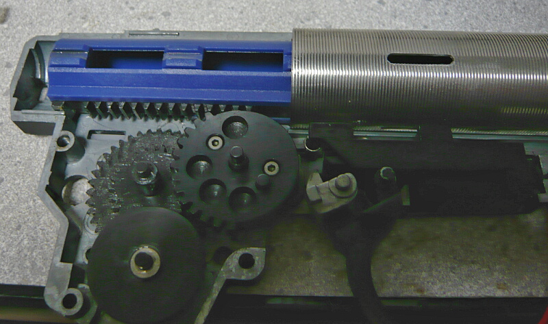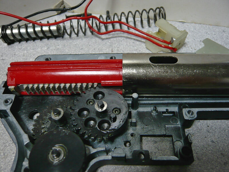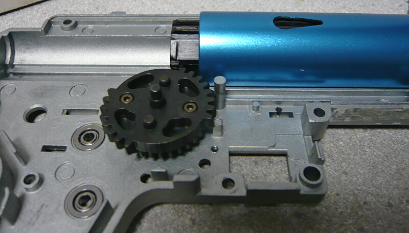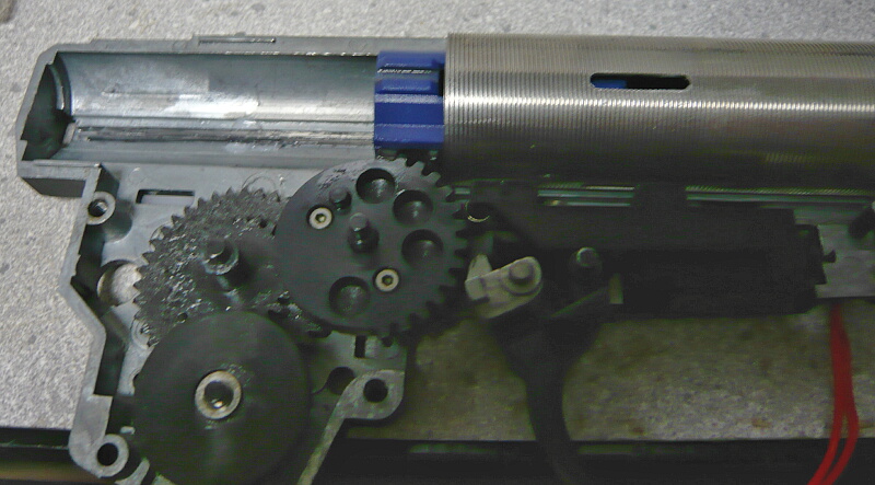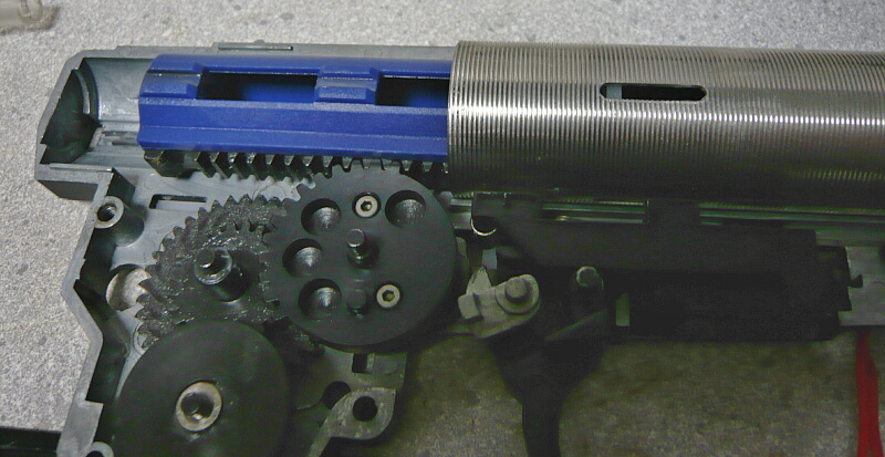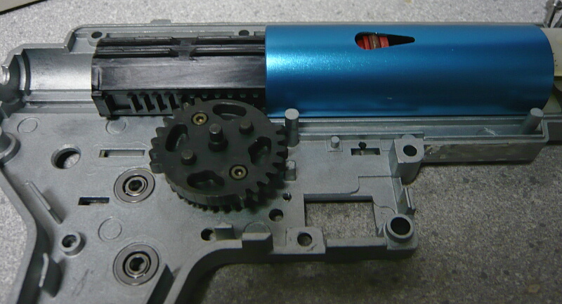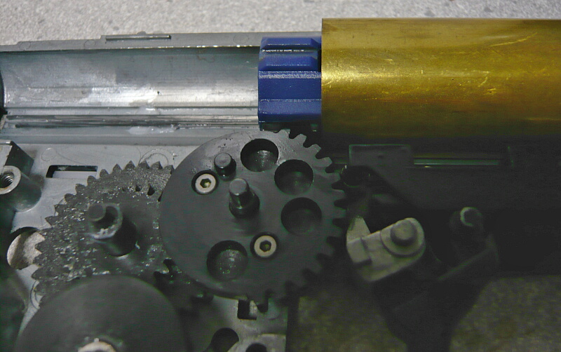 セクターギヤがピストンを引ききったところ。セクターカット(セクターギヤの引き始めと解放時のギヤを何枚か削り落とす事)をしているのでピストンが前後する範囲が少なくなっているので、当然加速シリンダーの横穴が引ききったピストンヘッドより後ろにあっても意味がありません。加速シリンダーではピストンはこの後横穴から排気しつつ穴より前まで高速で前進し、穴より前の部分から圧縮を開始します。シリンダー容積が小さいのでインナーバレルが長いと弾が銃口から出る前に吐出量を使い切ってしまい、ピストンが再び引き始めるとフルシリンダーと同様に弾を引き戻す力が掛かってしまうのでやはり初速が低下します。そのため、シリンダー容積が小さくなった場合はインナーバレルを短いものに換えます。しかしそれではシリンダーの小容量化と短銃身化で初速にとってはダブルパンチとなって大幅に減速してしまうので、スプリングを強いものに換えてピストンの前進速度を速めて初速を高めます。スプリングを強くするとピストンを引くのに大きな力を要求するのでサイクルは下がりますが、上げる場合はモーターを高速型のものに換えるか、バッテリーの電圧を高める事になります。