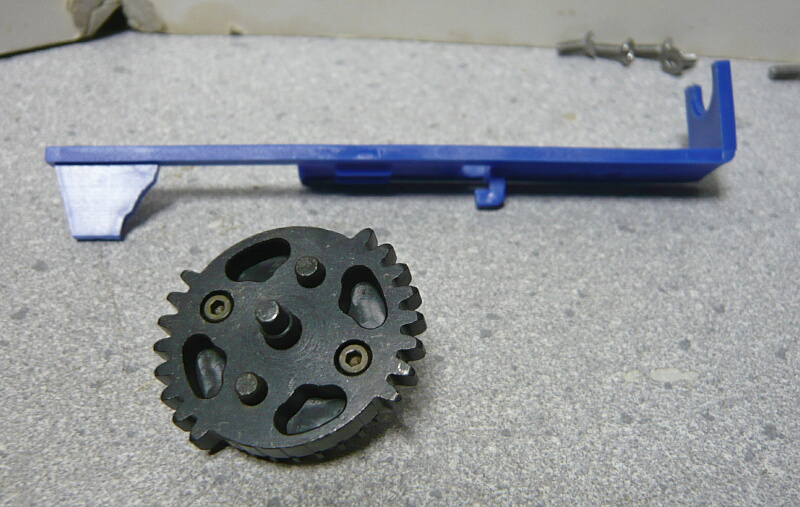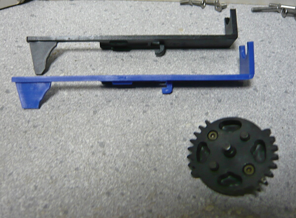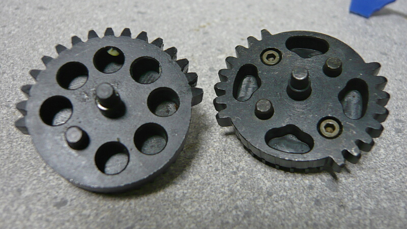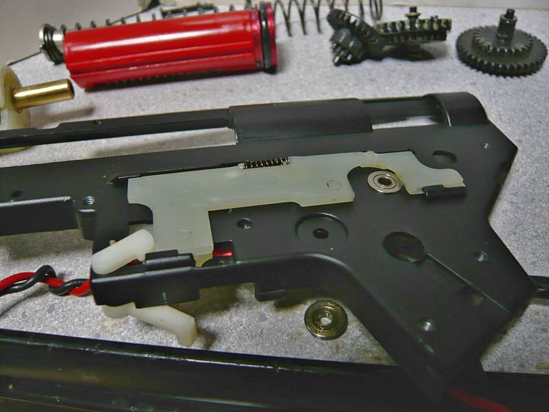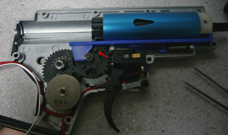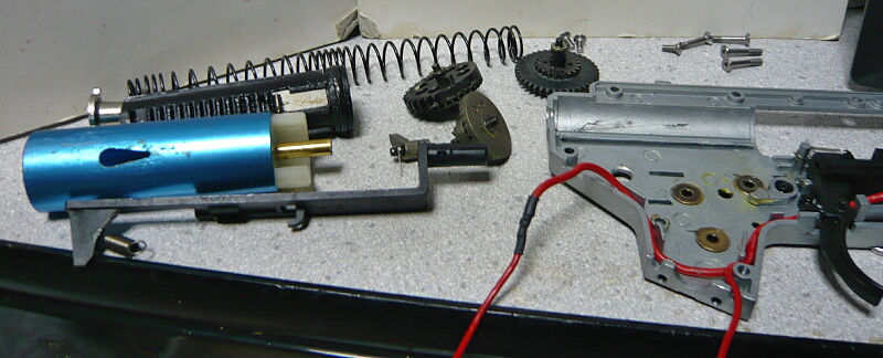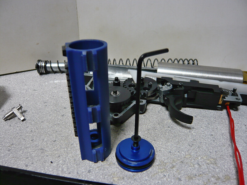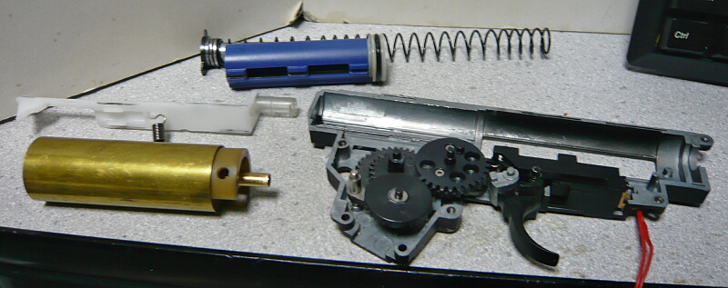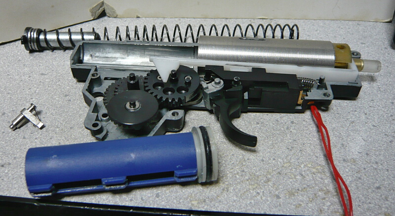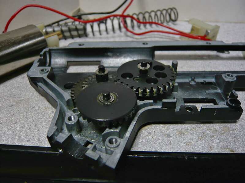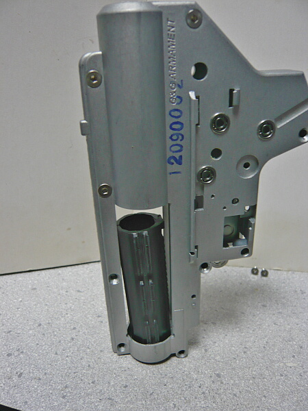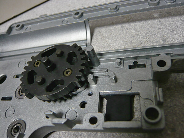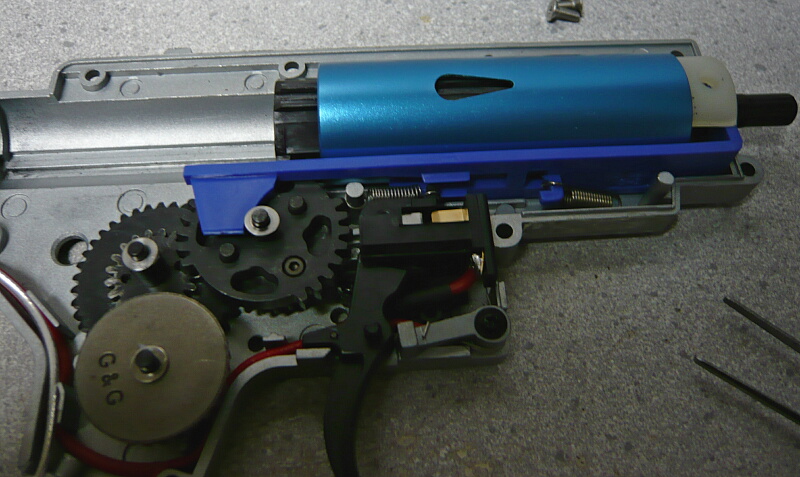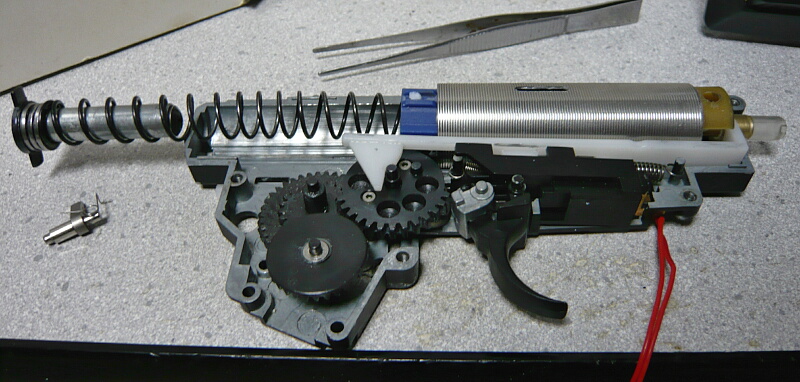 セクターギヤがピストンを引ききったところ。セクターカット(セクターギヤの引き始めと解放時のギヤを何枚か削り落とす事)をしているのでピストンが前後する範囲が少なくなっているので、当然加速シリンダーの横穴が引ききったピストンヘッドより後ろにあっても意味がありません。加速シリンダーではピストンはこの後横穴から排気しつつ穴より前まで高速で前進し、穴より前の部分から圧縮を開始します。シリンダー容積が小さいのでインナーバレルが長いと弾が銃口から出る前に吐出量を使い切ってしまい、ピストンが再び引き始めるとフルシリンダーと同様に弾を引き戻す力が掛かってしまうのでやはり初速が低下します。そのため、シリンダー容積が小さくなった場合はインナーバレルを短いものに換えます。しかしそれではシリンダーの小容量化と短銃身化で初速にとってはダブルパンチとなって大幅に減速してしまうので、スプリングを強いものに換えてピストンの前進速度を速めて初速を高めます。スプリングを強くするとピストンを引くのに大きな力を要求するのでサイクルは下がりますが、上げる場合はモーターを高速型のものに換えるか、バッテリーの電圧を高める事になります。