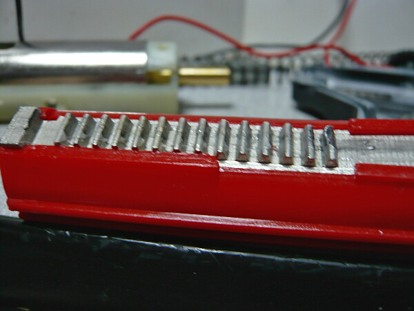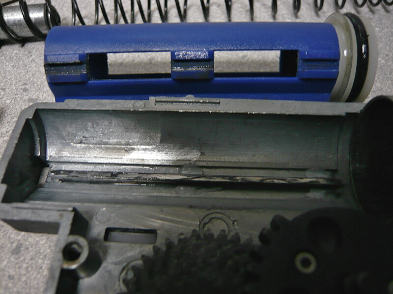 メカボックスのレールの谷側には盛ったグリスがそのままになっていて触れてすらいないので、山側が高い事になりますが、金属なので削るのは面倒です。それに寸法がおかしいのはピストンの方なのでピストンのレールの谷側を削る事になります。やや削りにくいですがリューターやヤスリでピストンの谷側をメカボックス内でスムーズに動くようになるまでシコシコと削ります。大体片側で0.5mmほど削る必要がありました。定番ピストンなのになぁ・・・