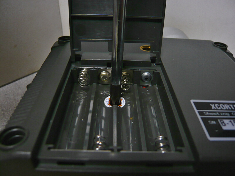 もう一か所、電池ボックスの中央にある封印シールの下にも1本。思い切ってドライバーをブスッと。