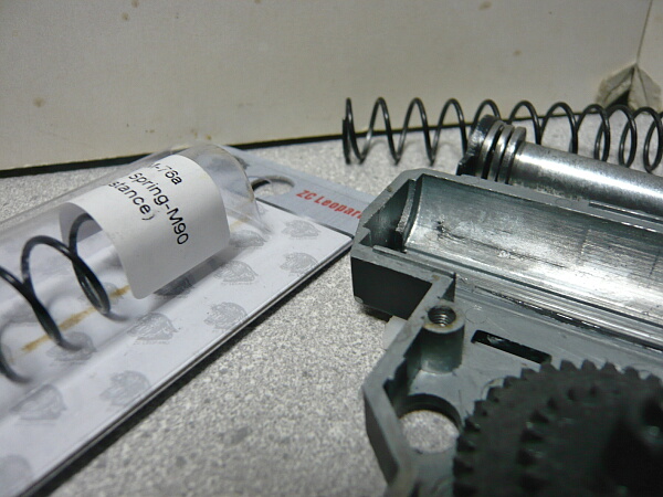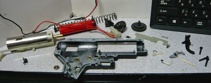 初速が95m/sとちょっと元気すぎるのでノーマルピストンヘッドに戻すついでにスプリングをM100からM90に戻します。この後組み直した後でスイッチのスプリングが外れててカットオフレバーが動かなくなってたのでもう一度開けたら部屋の隅のちょっとゴチャってるところへスプリングガイドが「もっと強い奴に会いに行く」とばかりに飛び出していって探すのに難儀しました。