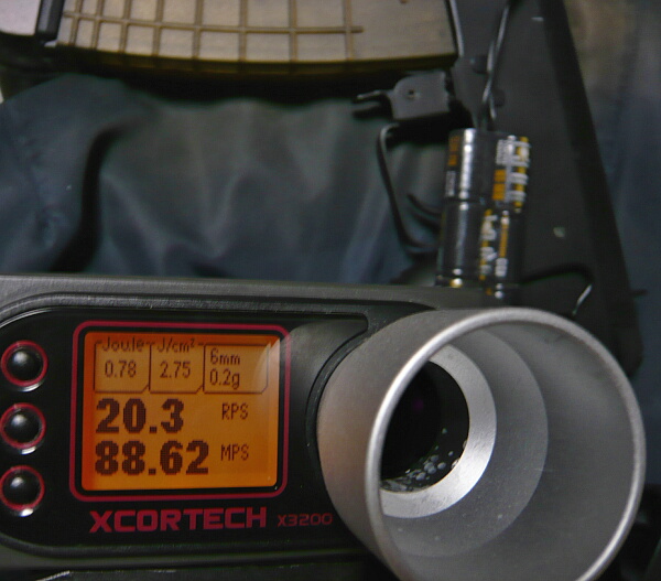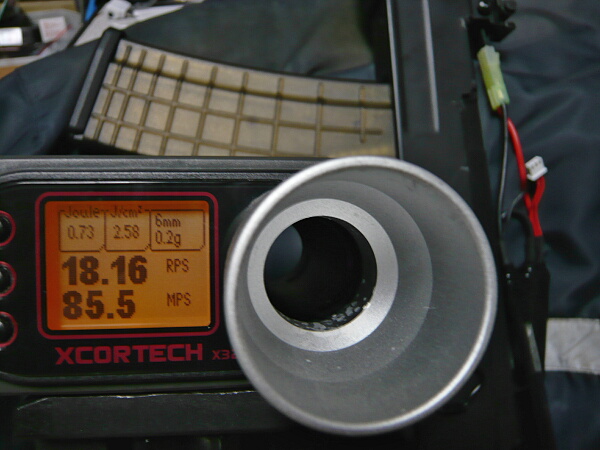 初速とサイクルのチェック。7.4Vリポバッテリーでサイクルは18弱から18強に微増、初速は80台に落ち着きました。