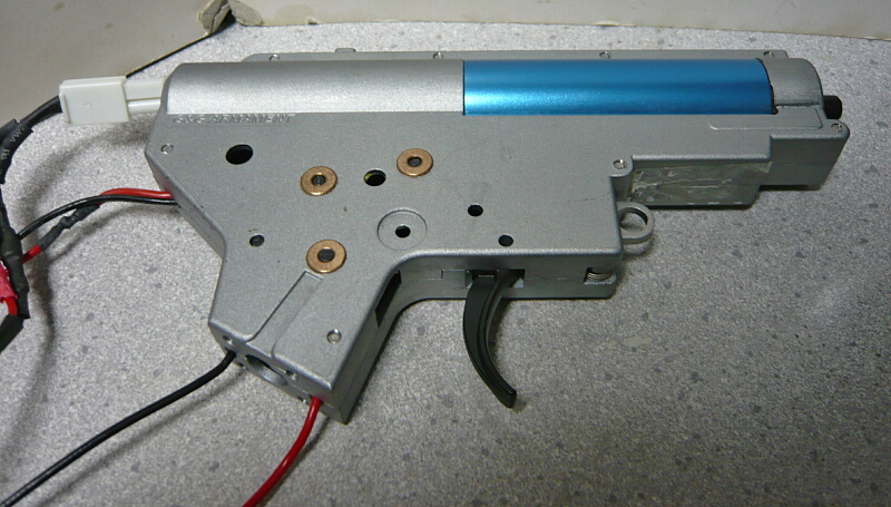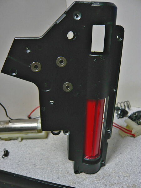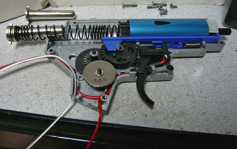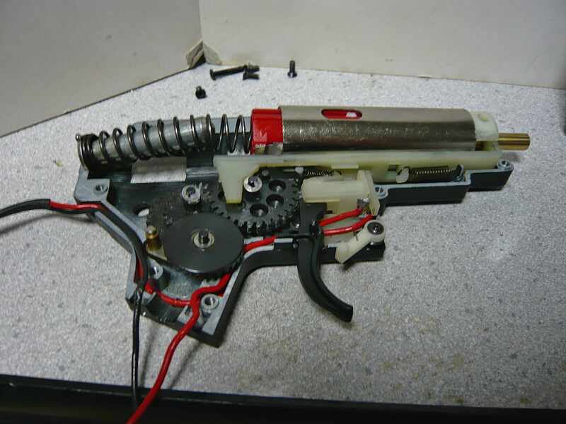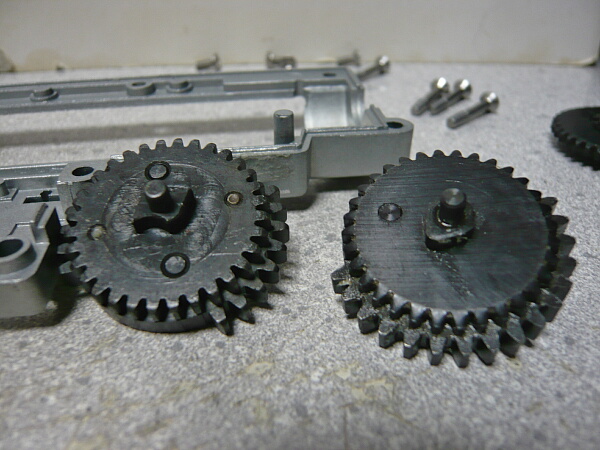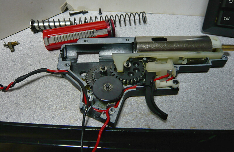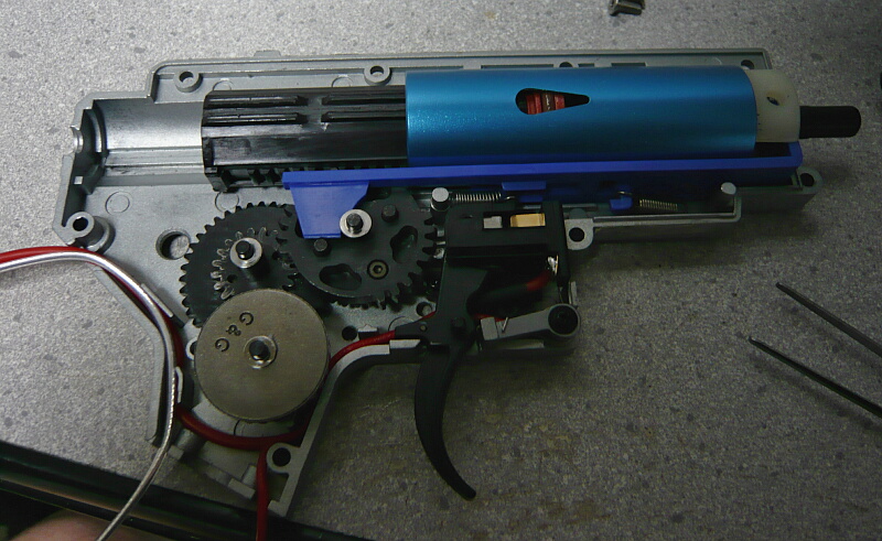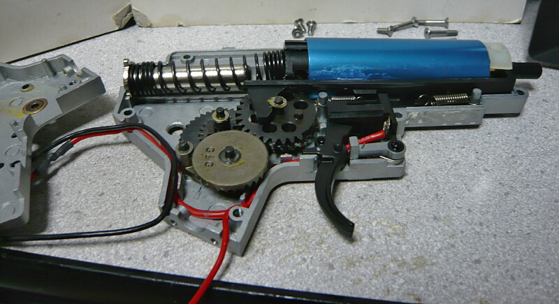 メカボックスを開けます。こちらは後方配線に引き直している他、ギヤをSHSの13:1に交換しピストンとピストンヘッドを強化品に換えています。