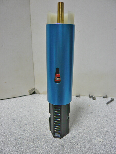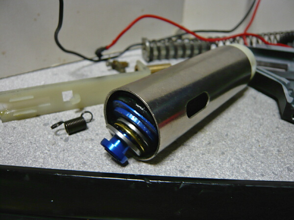 シリンダーは加速シリンダーですが穴は上写真で見えている1か所だけ。ピストンヘッドはスーパーシューターアルミピストンヘッドでシリンダーを支えられるくらいシリンダー内径にピッタリと接しています。