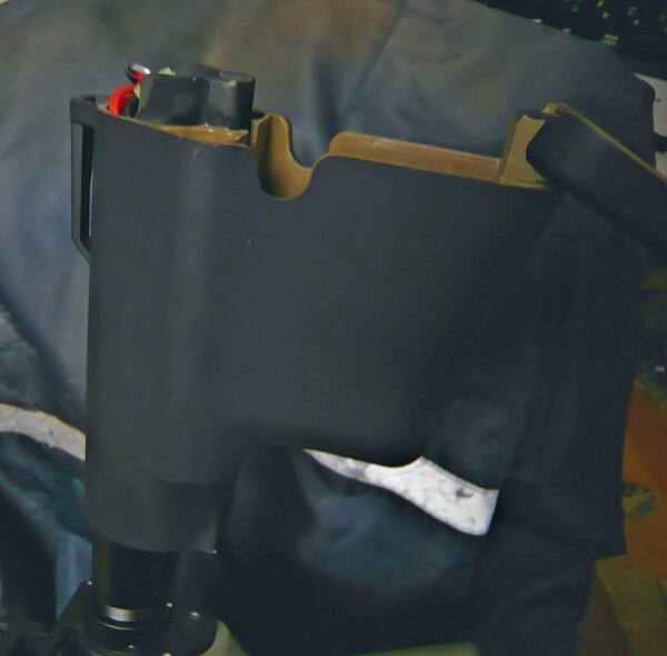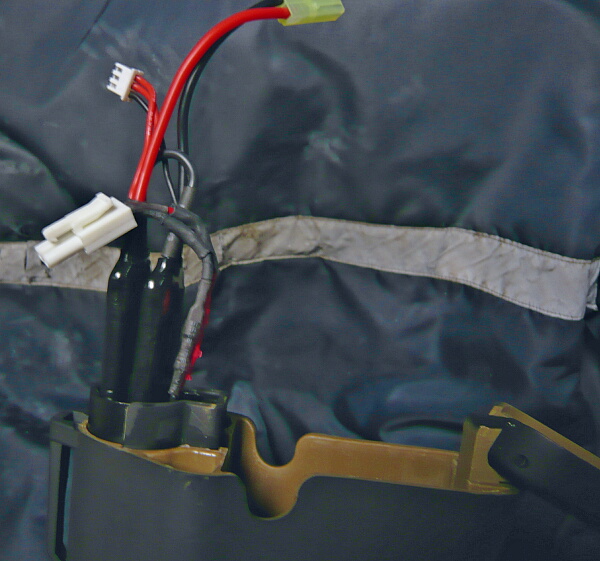 後ろ配線に直したためバッテリーはストックチューブ内に入ります。そのためワンタッチでバットプレートを開閉できるこのTROYタイプストックが便利です。マグプルのストックは軽いし使いやすいけどバットプレートがネジ留めされていて外すのが面倒だし、ブッシュマスタータイプみたいにストックチューブ後方が抜けているとバッテリーがこぼれてしまいます。ストック左右にセパレートバッテリーが入るものなどストックの収納スペースを利用するものだとストックチューブ内から後方での配線の伸縮に工夫が必要で、大抵は引っ掛かってストックを伸縮しにくくなったりします。