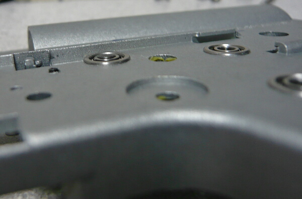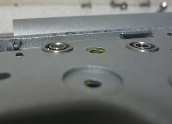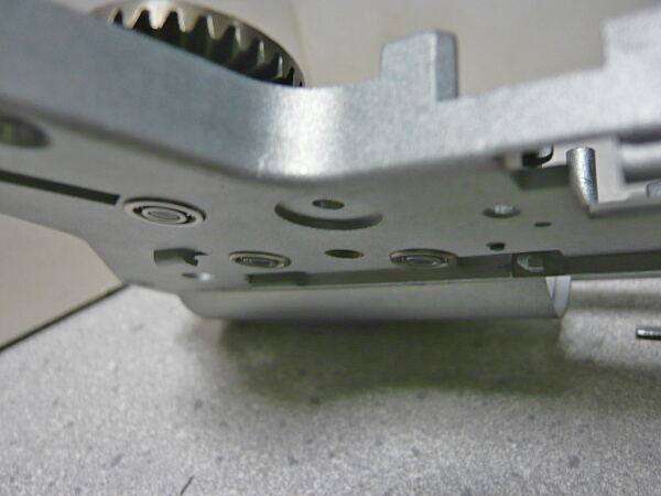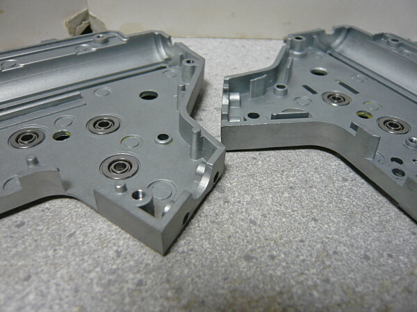 ただこのベアリング軸受けは元の軸受けが内側に若干飛び出していたのに対し、メカボックス内側にツライチになるため代価としてメカボックス内でギヤが左右にガタガタになり、重力で下になる側ではメカボックス外側に1mmほど飛び出してしまいます。ここは多めのシム調整で対処するしかありません。