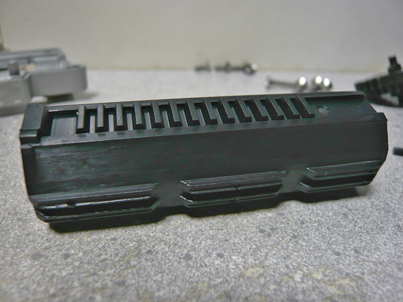空のメカボックスにピストン(ヘッドの有無は問わず)を収めてメカボックスのネジを締め、外側からピストンを前後に動かした時にスムーズに動かなければいけないのですが、メカボックス内のピストンを挟んでいるレールとピストン本体のレール間の寸法が合っておらず、動きが悪くなっていたようです。これはSHSのこのピストンではよくある事のようです・・・(左右レール間の寸法は海外製電動ガンの場合少し余裕をもって広めにされているものがあるらしく、SHSのピストンはそちら向けになっているようです。マルイ製メカボックスでは狭いため今回と同様の問題が出ます。)