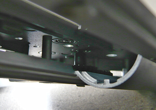 メカボックス内を覗き込むと、この状態でもまだ右内側にはかなり浮いていて、相当な量のシムを挟む必要がありそうです。