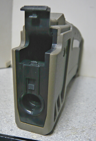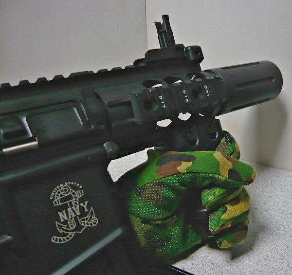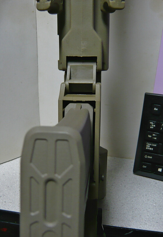 握り心地、というよりは添え心地と申しましょうか。フィンガーチャネルがあるので人差し指を前側に添えていますが、この人差し指と親指の居心地がやや悪く、人差し指をグリップ部に添えると小指が下にはみ出てしまいます。またここへ手を沿えるとストックのバットプレートを肩へ押し付ける力が加わり、それによって銃を安定させる働きももつので、ストックが無い銃だと右手の疲れが増える傾向にあります。