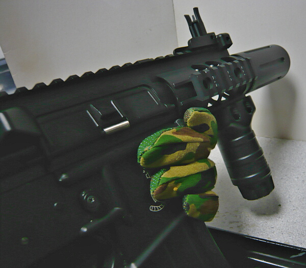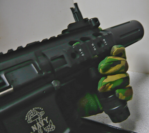 ハンドガード下にフォアグリップを装着した場合、このように丸握りするか、