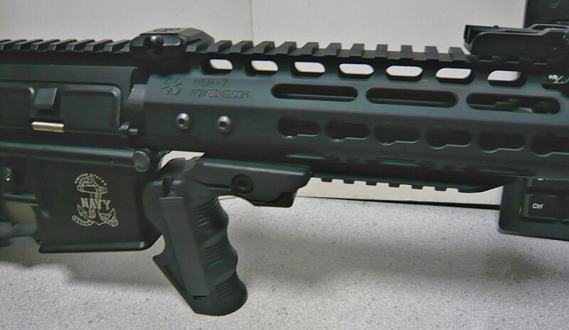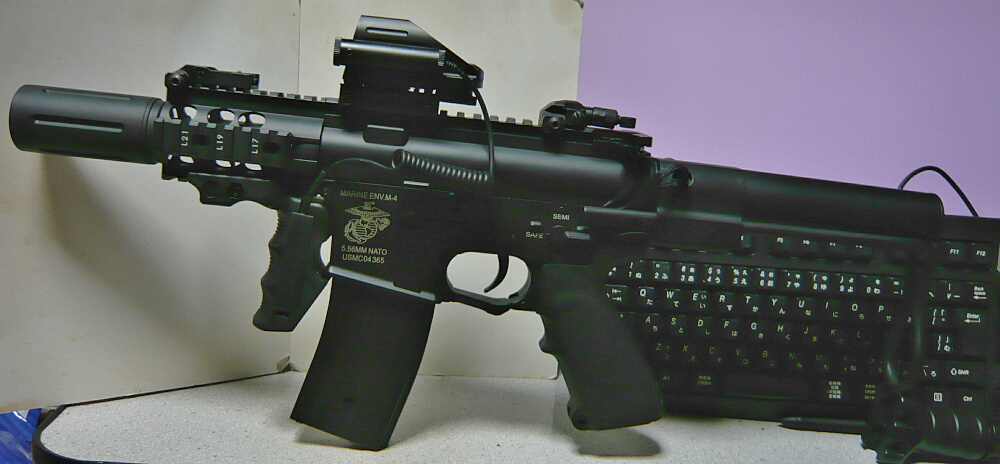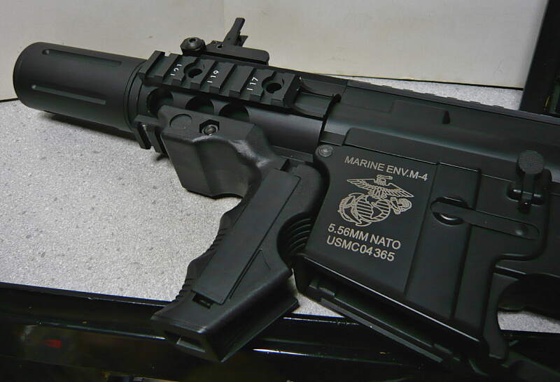 取り付けたところ。ハンドガード下のレイルがかなりマグウェル側へ近い所まである必要がありますが、M4のロワレシーバー前端のマグウェルにおおよそ沿う形になっています。もちろんアンダーレイルさえあれば銃はM4系でなくともOK。