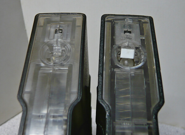 マガジン上部のリップ周辺。右は削り過ぎて弾が止まらなくなってしまったのを補修しているためプラ板が貼ってありますが、マガジンフォロワーの先端が丸だったものがくぼんだ形状に変わっています。