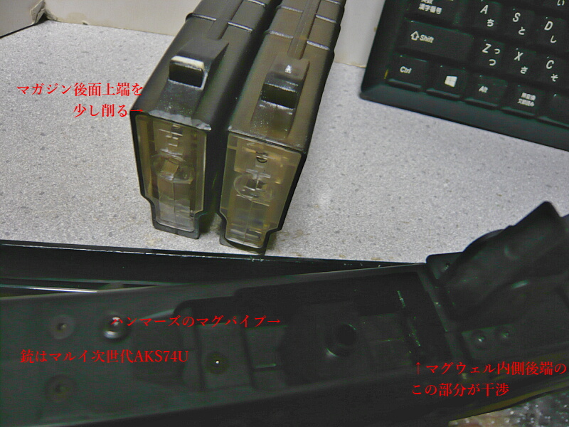 マルイ次世代AKS74Uにハンマーズのマグパイプを装着していますが、そのままでは刺さりきらずマガジンキャッチが掛かりませんでした。