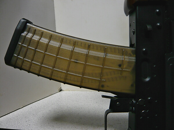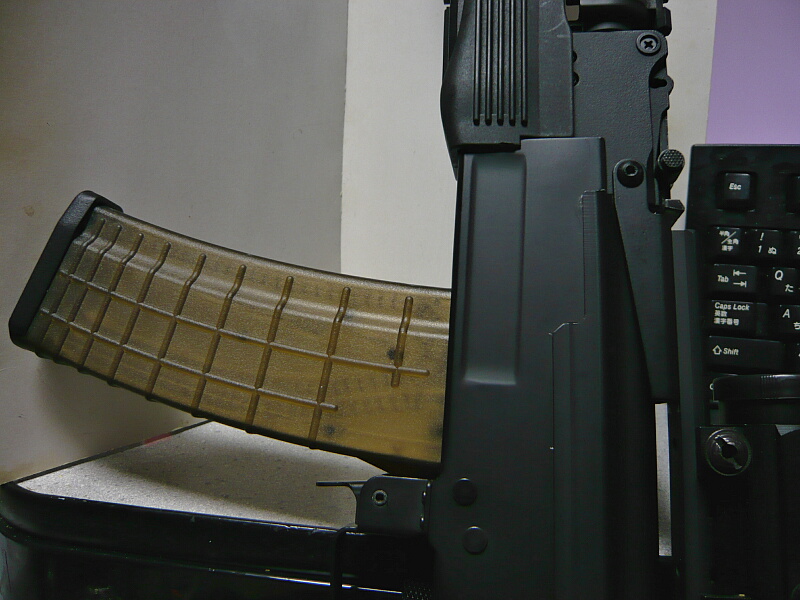 マガジン側の加工を最小限にすべく銃側を多少調整(マガジンキャッチとレシーバーの間にワッシャーを噛ませ、マガジンキャッチも適宜に削っています)しているものの、マグウェル内側後端にわずかに突き出ているメカボックスが干渉しているのでマガジン側を若干削れば入るハズです。