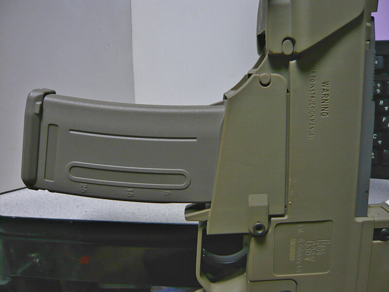 S&TのG36へ装着。G36のマガジンはマグウェルにぶつかる位置にリブがあって強めに差し込まないとロックが掛からないのですが、このマガジンはスムーズに刺さるため「え?ちゃんとロックされた?」とついマガジンを揺すって確認してしまうほどすんなり装着できます。もうちょっとカチッと手応えがあってもいいくらい。