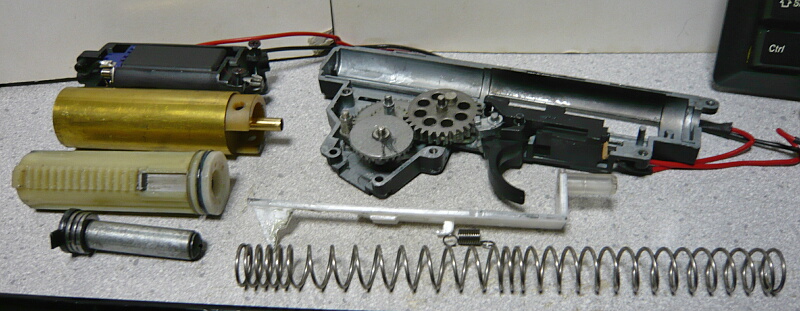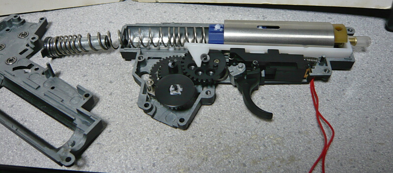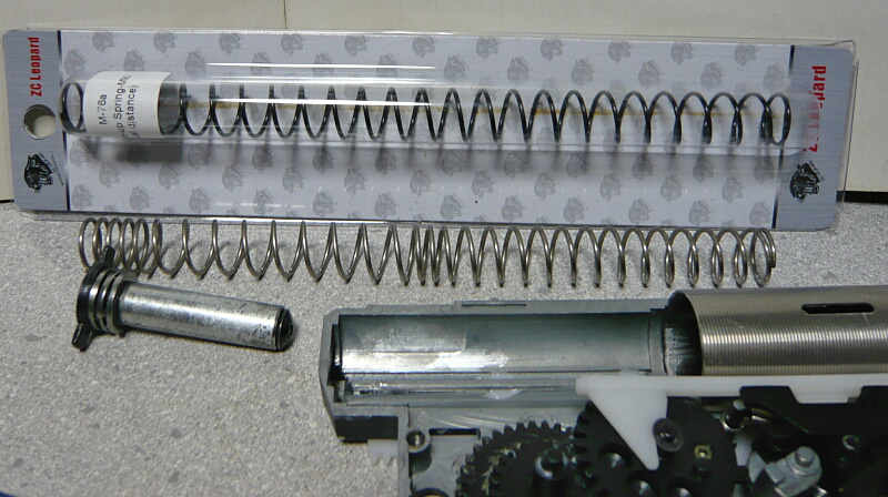 セクターカットは1枚落とすと初速が5m/s下がるという話ですのでスプリングを強化。ZCレオパルドのM100スプリング。