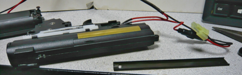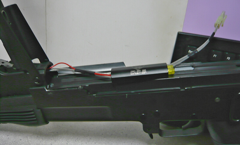 銃を組みたてます。FETユニットは何も考えずに出すとバッテリースペースを占有するので前方のガスパイプ内へ収めてコネクターだけリヤサイト下から出した方が良いでしょう。
