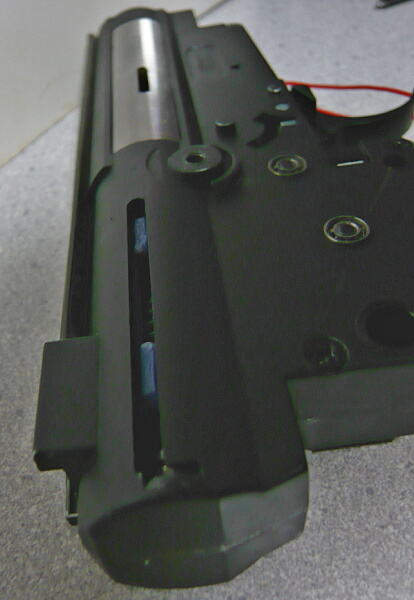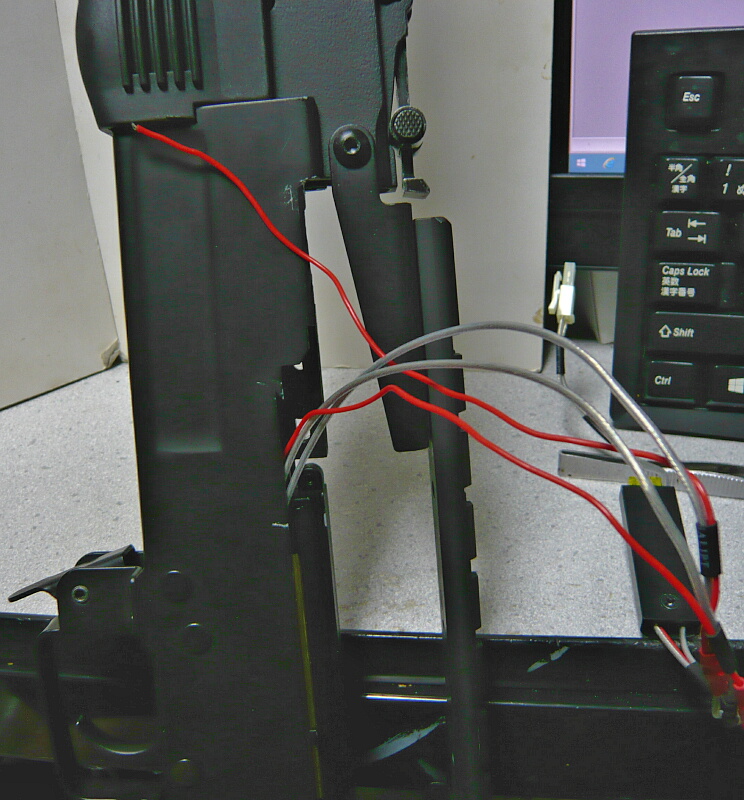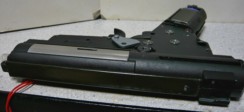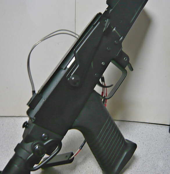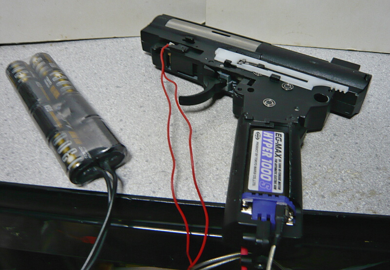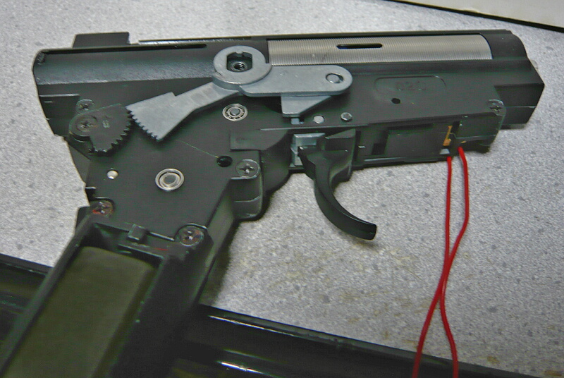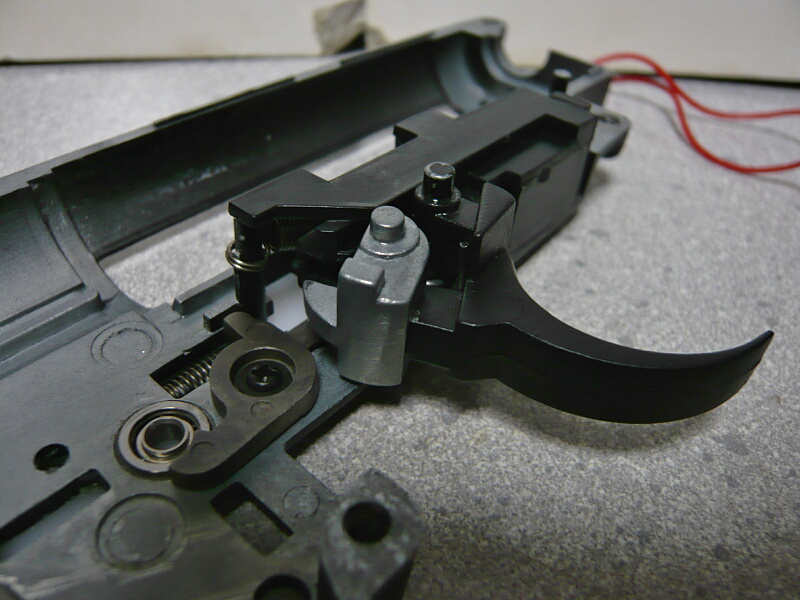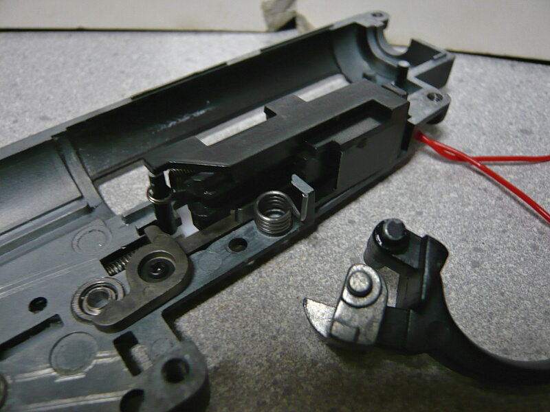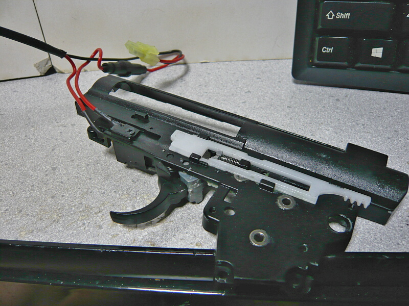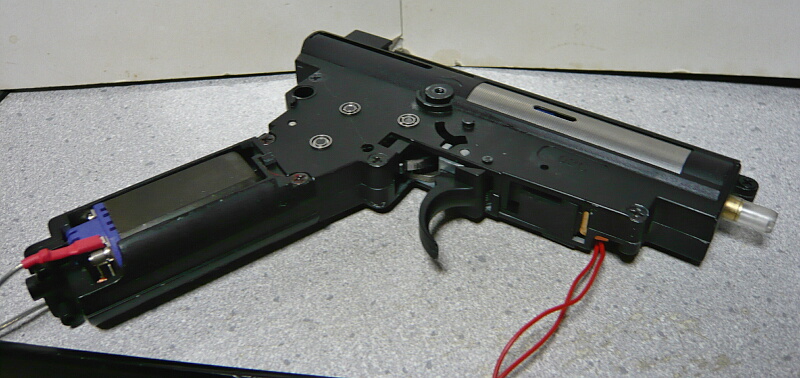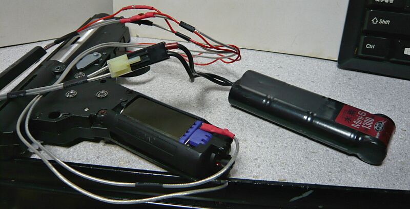 試射・・・と思ったらスイッチの配線が1本もげていました。もげた状態でも普通にセミオートで撃てるんだけど、何ででしょう??とりあえずもう一度バラしてハンダ付けし直しました。