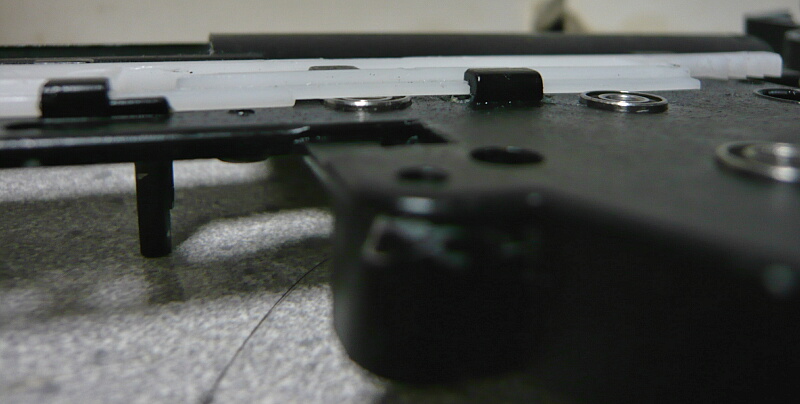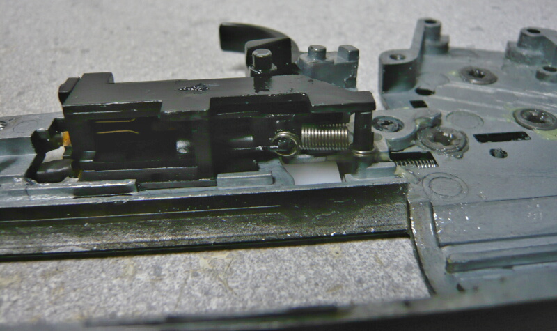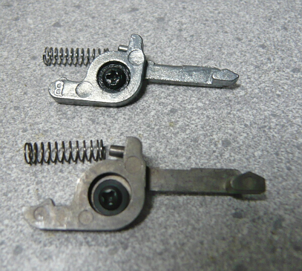 上の銀色のものが元のカットオフレバー。カットオフレバーは上側のスプリングで水平位置に保持されており、セクターギヤのカムによって左側のアームが押し下げられ、一方でシーソーのように右側のアームが持ち上がります。セレクタープレートがフルオートの位置にスライドすると右側のアームが持ち上がった状態で保持されるので、持ち上がってる状態でのみ発射動作が行われるのでしょうか。