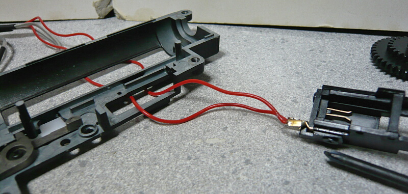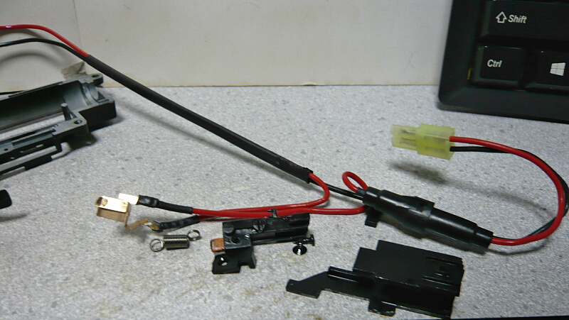 銃に付いてたVer.3メカボックス用のスイッチの端子にFETのスイッチ配線を付け直しました。どっちが+-とかはないのでとりあえず付ければOK。