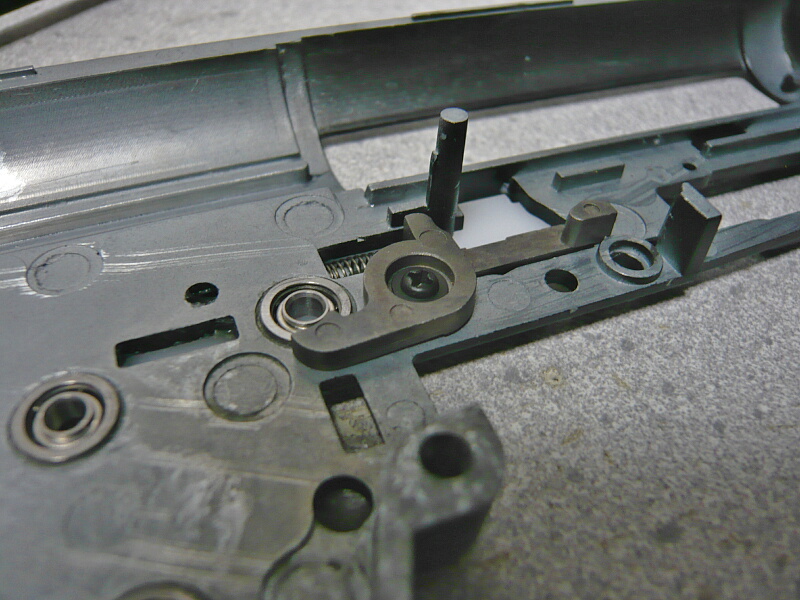 トリガーとカットオフレバー、メカボックス左側の外側に取り付いているセレクタープレートを外します。軸受けも。スプリングなどは失くさないように注意しましょう。