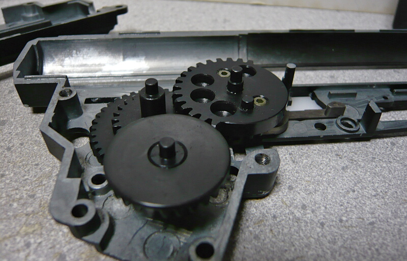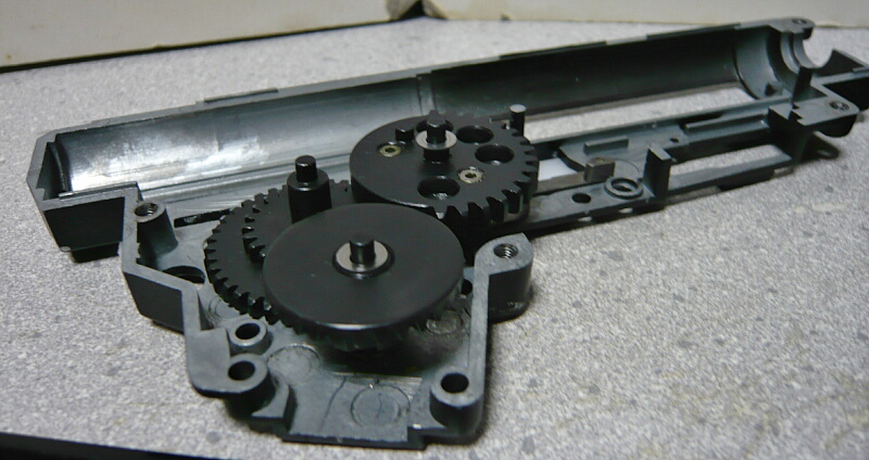 元のセクターギヤ(右の銀色のもの)との比較。よく見ると元のセクターギヤは軸周りにあるカットオフレバーを動かす楕円形のカムが欠けていました。セミオートがロックしたり、高電圧バッテリーを繋ぐとセミが2バーストになったりしてたのはここが欠けてカットオフレバーの動きが悪くなってたからかもしれません・・・