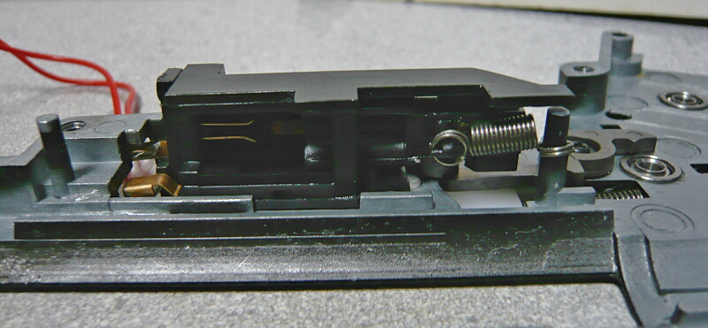 端子をスイッチに収めて小パーツをネジ留めして固定し、オス側スイッチを収めてメカボックスにあてがい、スプリングを取り付けてスイッチの取り付けは完了。