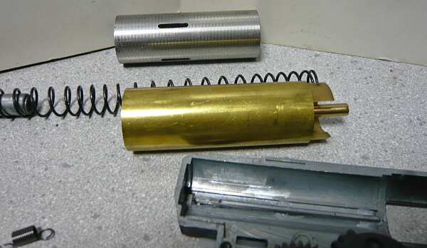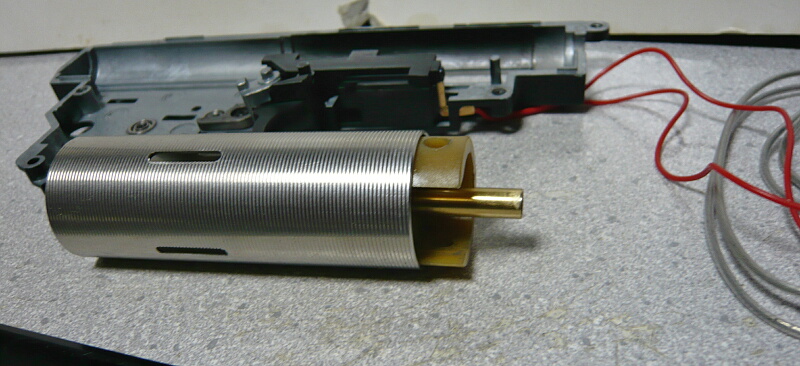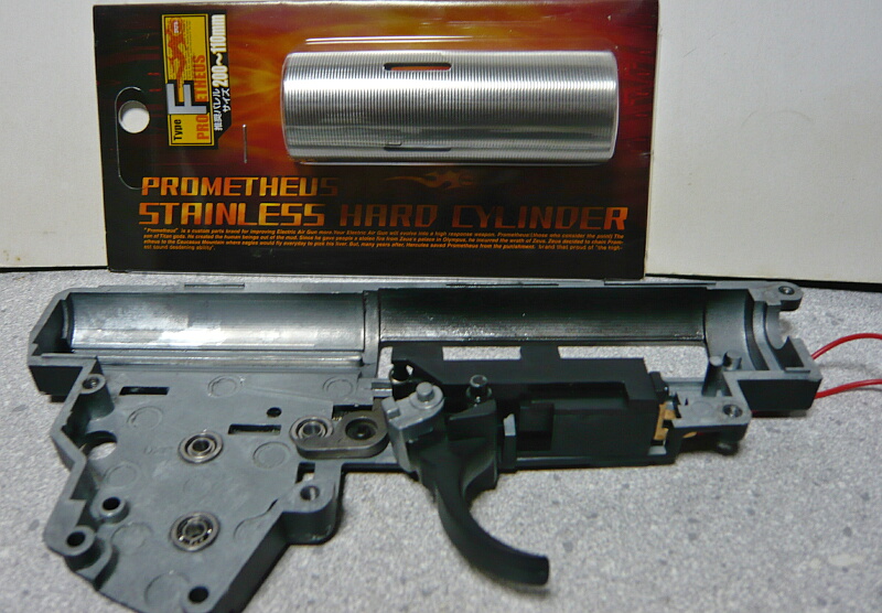 元のフルシリンダーではハイサイクルには吸気が追いつかないので加速シリンダーに換えます。ライラクスのステンレスハードシリンダーF、対応するインナーバレル長は200~110mmとなっています。