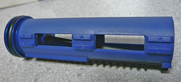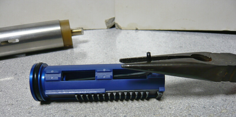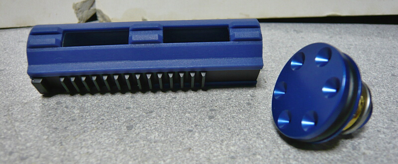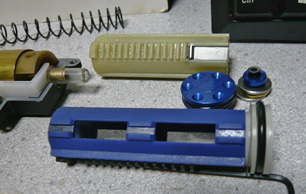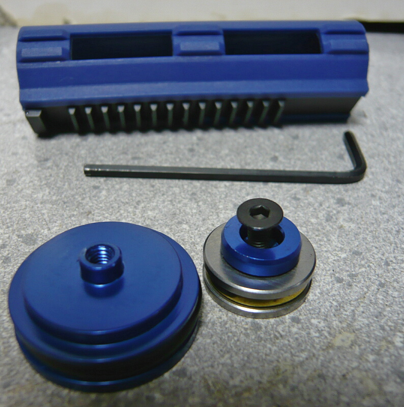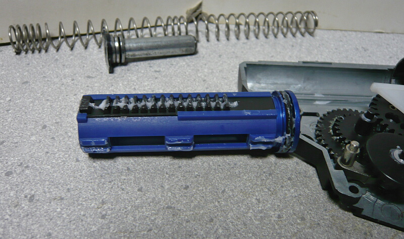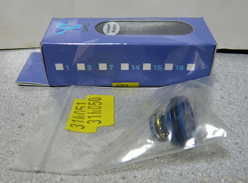 元のピストンは15枚ギヤで引き側2枚目がカットされていない普通のタイプなので少々不安があります。幸いピストンヘッドは分解できるものだったのでSHSのピストンにこのピストンヘッドを取り付けました。ピストンヘッドの前側からネジが刺さり、ピストン内側の四角形のナットで留められていました。規格にそった形状のようでピッタリ取りつきます。