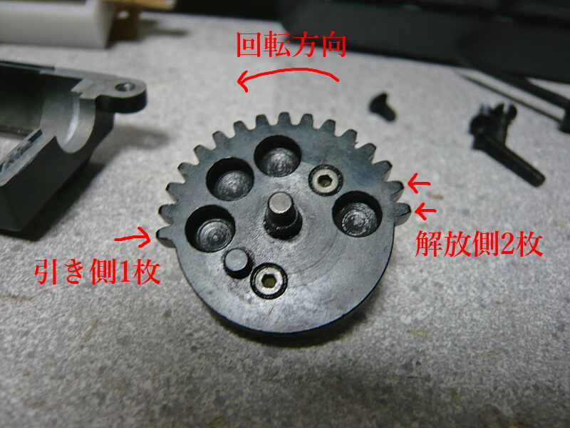 解放のタイミングを早めたらいいのかなぁ・・というわけでセクターギヤを取り出してギヤの歯を削り取る「セクターカット」を行ってみましょう。削るのは定番な引き側1枚・解放側2枚。