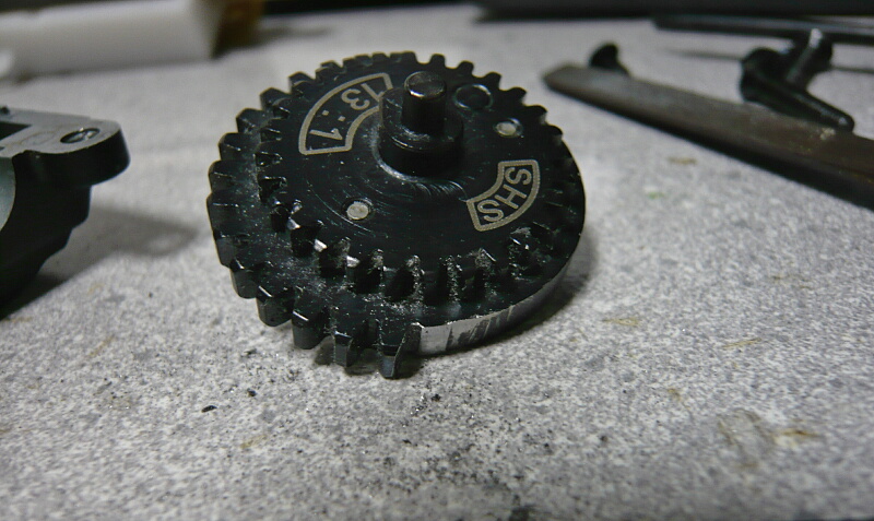簡単に申しますがマルイ純正の亜鉛合金のギヤみたいにニッパーでちょん切れるようなものではなく、こちらは鉄製の強化ギヤです。プラモ用の安いリューターでは全く話にならなかったのでヤスリでガシガシ削り落とします。ヤスリは折れて長さが2/3ほどになった四半世紀前から愛用している普通の平/丸ヤスリ。つらい。