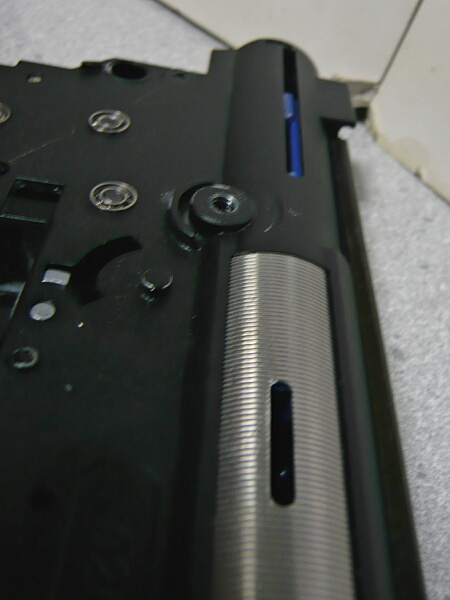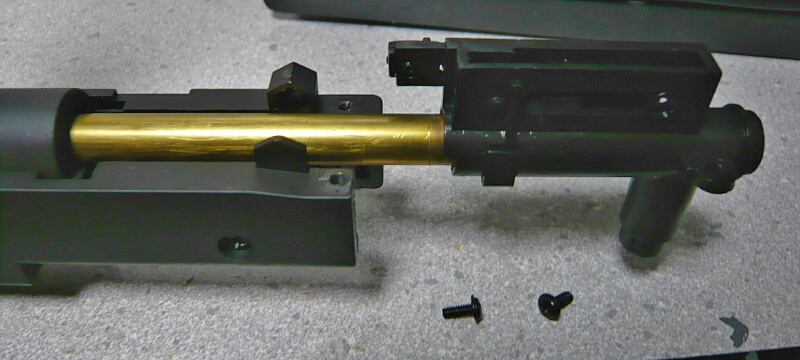 後ろが解決したので次は前側。チャンバー左右のネジを外してインナーバレルをフロントセクションから引き抜きます。