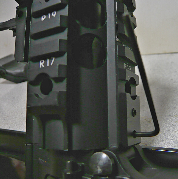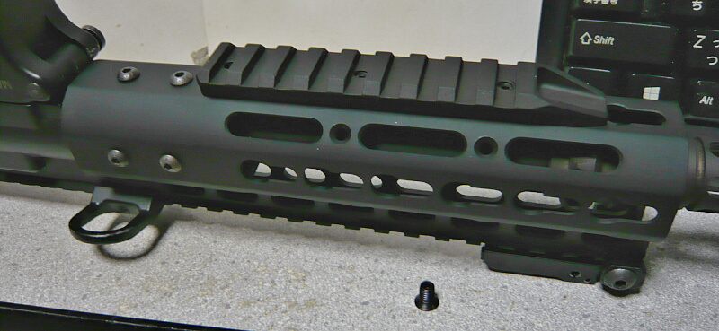 Keymodハンドガードは細いためバレルナットのある位置にはアクセサリを付けられないのでレイルを付けてもハンドガード後端から遠のいてしまいます。レイルのネジ後ろ側1個を外すとKeymod穴1個分だけ後ろに寄せる事ができます。