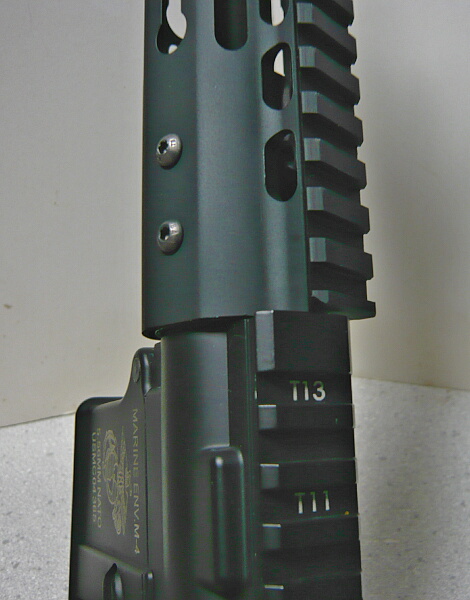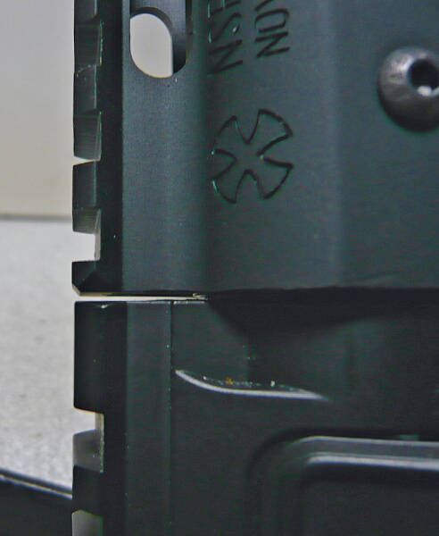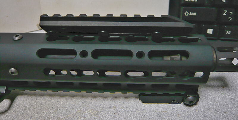 でもちょっとだけ隙間が開く・・・これは仕方ないかな。アッパーレシーバーの方のネジ切りによって変わるので、このハンドガードは隙間が開くからダメだ、というわけではありません。隙間は開くもののレイルの高さは大体丁度良いです。ただしこれもアッパーレシーバーとの相性次第。
