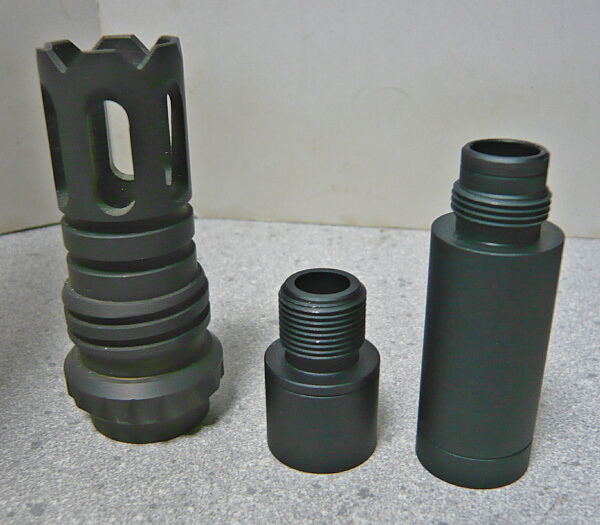 余り物でいってみましょうか。左のハイダーは基部が太くて長い銃にしか似合わないので長らくマルイM4に使っていましたがカッチョイイMB556ハイダーに換えてしまったので浮いていました。ハイダーのネジが正ネジなので真ん中のKMの変換アダプター、右が同じKMの延長アウターの短い方。