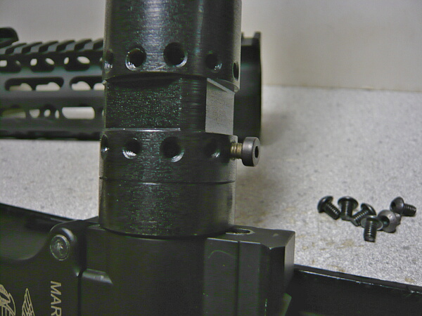 ハンドガードの回転止めに付けたRSAが邪魔で勘弁ならなくなったので別の方法で固定する事を考えると、バレルナットの上側の穴にネジピッチの同じネジをねじ込んでアウターバレルに固定するのが丁度良さそうです。このネジは多少飛び出ていてもガスチューブの通る部分に逃げるのでハンドガード内側に干渉する事はありませんが、このためにガスチューブは取り付けられなくなります。ガスチューブを取り付ける場合はイモネジを使うのが良いでしょう。もしくはハンドガード外側からバレルナットに固定するネジを1本だけ長い物に換える手もあります。