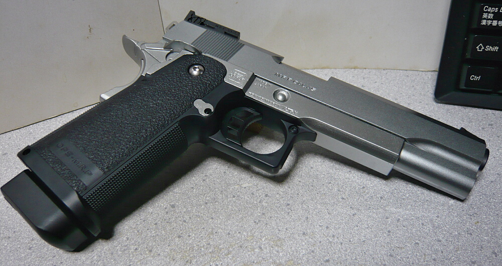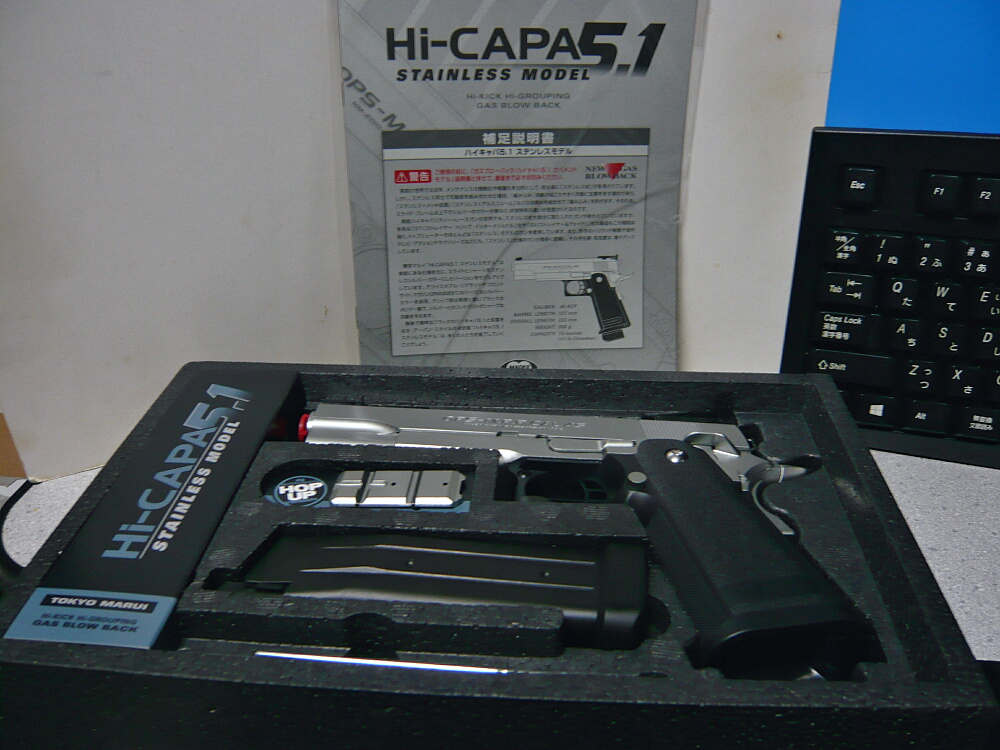 何で今頃ハイキャパ?だって急に欲しくなったんだもの。でも黒が無かったのでステンレスモデル。先日発表された電動ハンドガンのハイキャパEでは当然なく、10年以上前からあるガスブローバックモデルです。