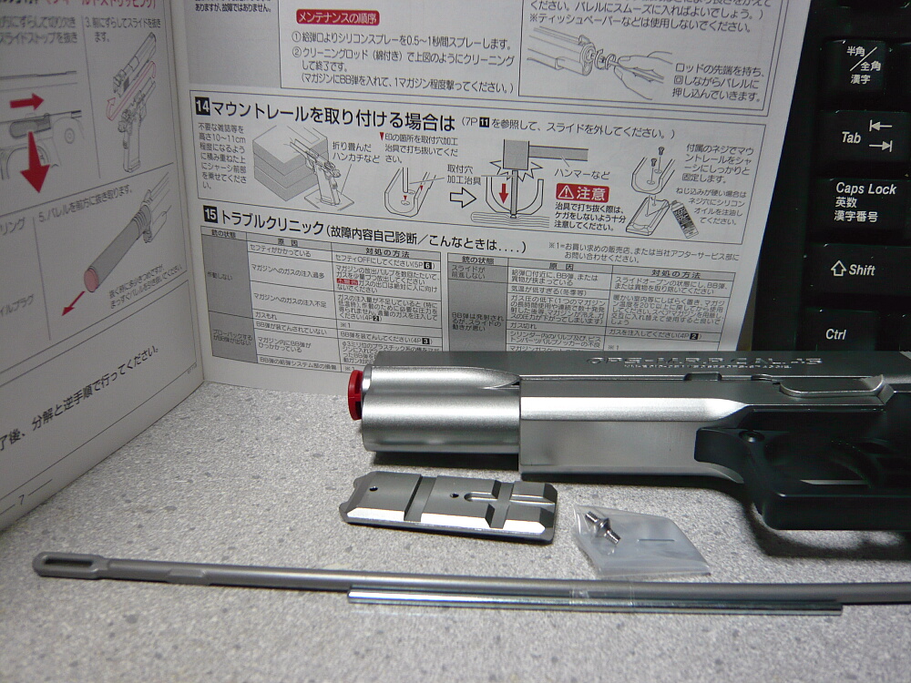 内容は銃本体、マガジン、BB弾(0.2g?)クリーニングロッド&治具、アンダーレイルとそのネジ、フォロワーストッパー2個。フォロワーストッパーはマガジンに装着してスライドストップがかからないようにする、空撃ち用のアダプターです。