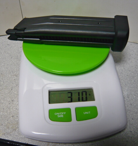 ガスも弾も入れてないマガジン単体の重量は310gほど。タクティカルリロードなどしてマガジンを床に落とすと、マガジンバンパーがゴムではなくプラ製なので床もマガジンも壊れます。そもそもガスガンのマガジンを実銃のように床に落とすのはご法度ですが・・・