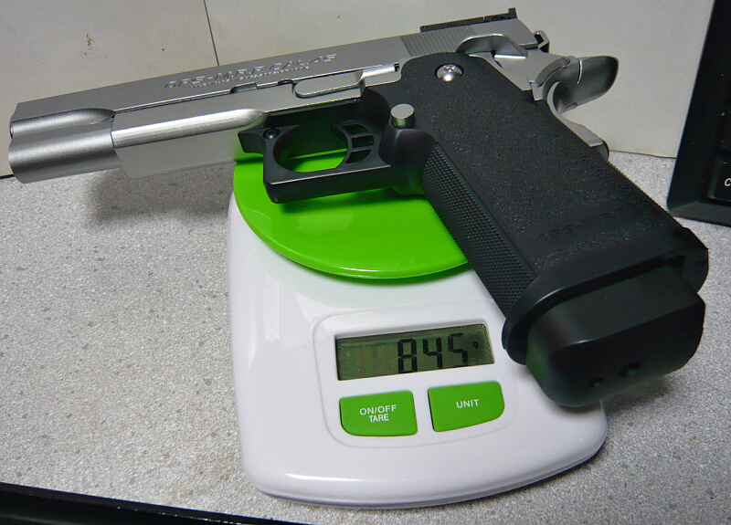 マガジン込みの銃の重量は845g。実銃は900gなのでかなり近い重量です。カタログスペックより軽いのはアンダーレイルを付けていないからでしょう。お世辞にも軽いとは言えない重量ですが、そこは雰囲気。