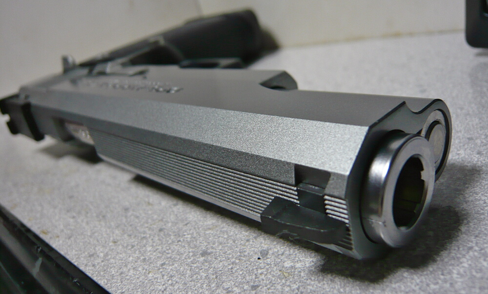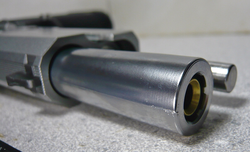 アウターバレルはテーパータイプ。前方に向かって太くなっており、ガバ系のスライド前端に嵌められるバレルブッシュが省略される代わりにこういう形になっています。ただ、プラ製メッキ仕上げのアウターバレルにはかなり目立つパーティングラインが残っています。気になる人は社外品の金属製アウターバレルに換えると良いでしょう。