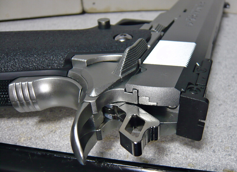 グリップパネルはフレームと一体型ですが、トリガーガードからグリップにかけての黒い部分は実銃でも一体型の樹脂製で、その上に金属製のアッパーフレームが結合されている構成。これのおかげで1kgを超えるガバより太いのに100g以上軽い重量を実現しているのでしょう。握り心地は他の人のレビューでよく聞くようにややグリップ前面が四角く感じるものの、「握りにくい!」と思う事は無いでしょう。ダブルアクションの銃とシングルアクションの銃ではグリップの握り方が少し違い、シングルアクションの銃は手首に対して銃を真っ直ぐにするように握るのに対し、ダブルアクションの銃はやや利き手の方に寄せて、右利きの場合やや右側のグリップパネルを手のひらで包むように握ると聞いたことがあります。ハイキャパのグリップはややダブルアクション銃の握り方に寄せているような印象を受けます。なのでトリガーに当たる人差し指の位置もシングルアクションでは指先と関節の間の腹の部分で引きますが、この銃はダブルアクションのように関節部分に当てて引くとしっくりくるような感触。