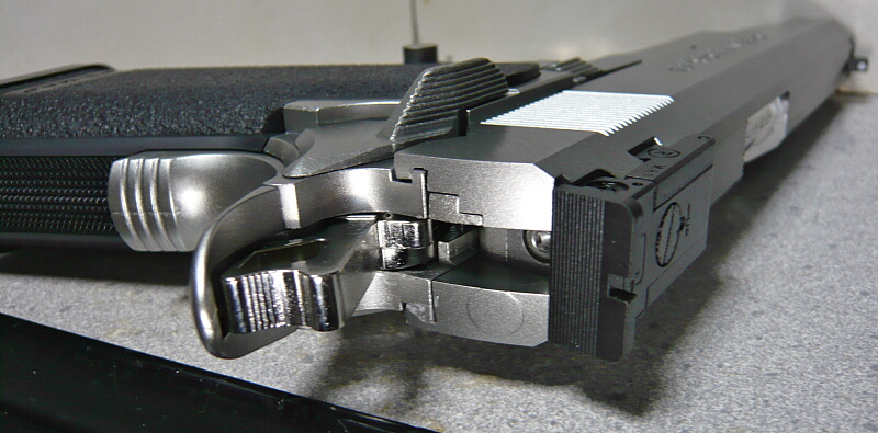 フルコックはこの位置。親指でハンマーを起こすとフレーム後端(正確にはグリップセイフティの延長)のビーバーテイルが邪魔をしますが、これのおかげでブローバック時に勢いよく起きたハンマーが親指の付け根にぶつかる事はありません。ハンマーがフルコックの位置にある時のみ左右アンビタイプのセイフティレバーを上げる事ができます。セイフティは動作が小気味よく操作感が非常に良好。
