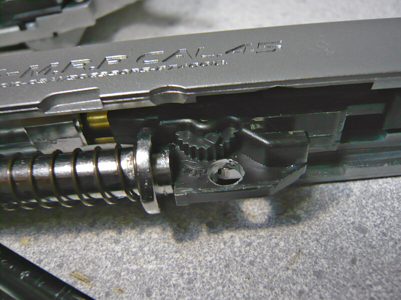 このもう一つのセクターギヤがフレーム内側に沿って配置されているラックギヤを引き、そのラックギヤは前方のリコイルスプリングの前までつながっており、スライドを引く動作を担います。スライドを引ききった後にセクターギヤの歯から解放されると、リコイルスプリングによってスライドは前進位置に戻ります。