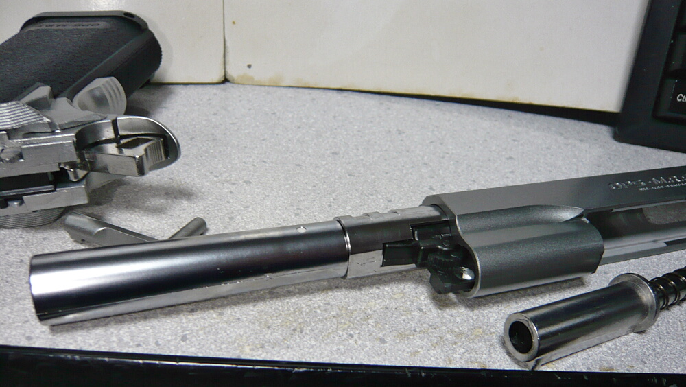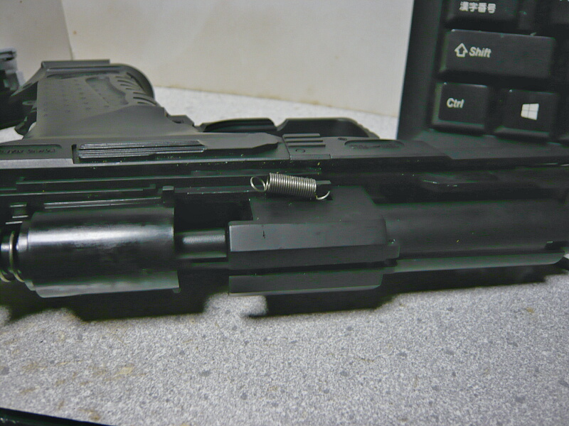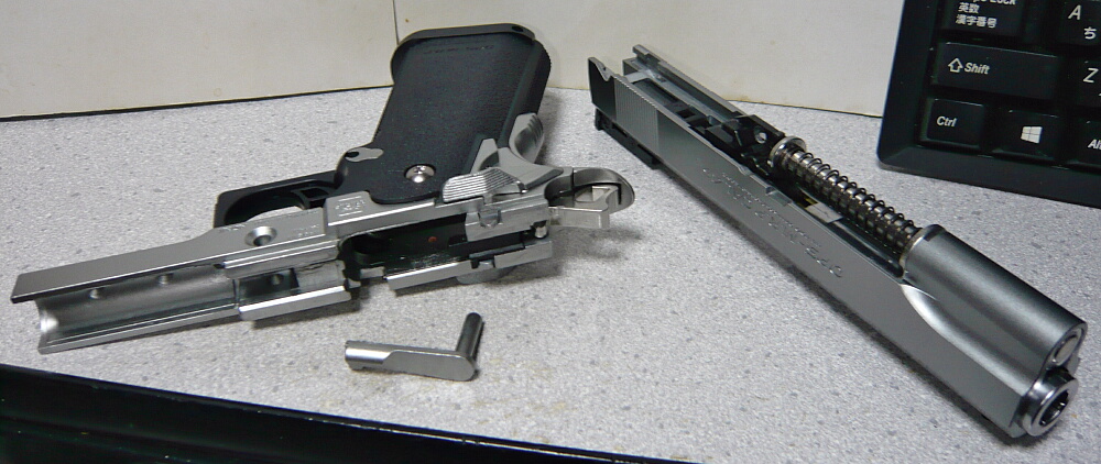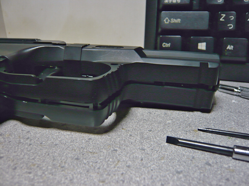 さて通常分解してみましょうか。ガバ系のセオリー通りスライドをちょっと引いてスライドストップと分解用ノッチ(スライドストップの掛かる切り欠きの後ろ側にある小さな切り欠き)を合わせ・・・
