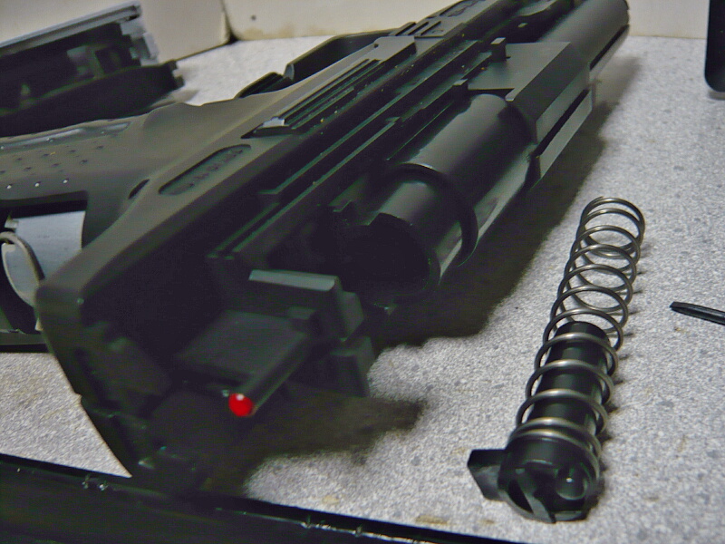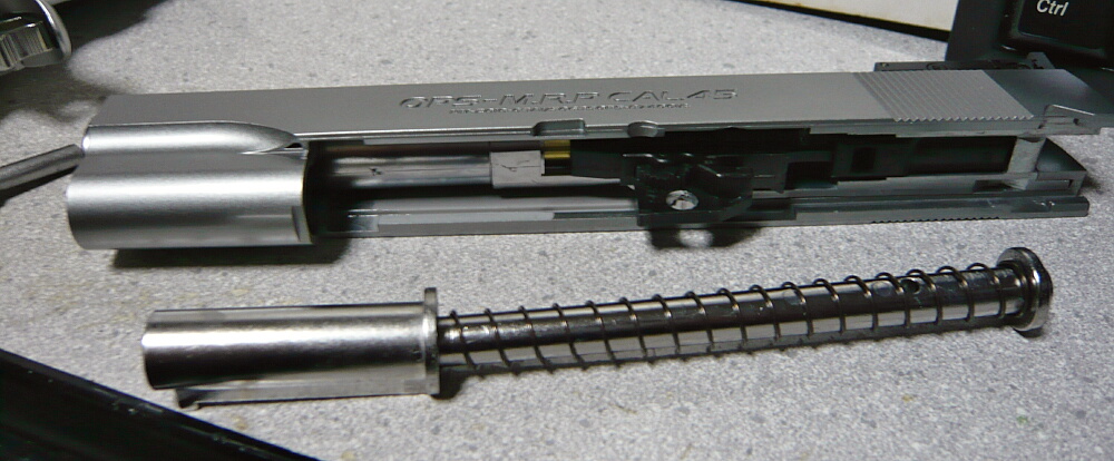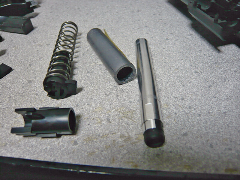 更にバラすにはスライド前側下半分の内側に後ろ側から差し込まれている筒状のパーツをリコイルスプリングガイドに沿って後ろ側まで引き寄せ、リコイルスプリングガイドを前側に押しながら下へずらすようにして外します。